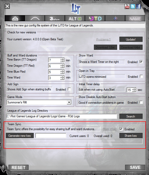 Diese Version beinhaltet eine Funktion mit welche man quasi einen Team key registrieren lassen kann. Dieser key läuft dann auf allen Systemen des Team. Ein einmal aktiver key bei allen Teammitglieder führt dazu, dass sich alle LJTD's synchornisieren. Somit wird sicher gestellt, dass jeder im Team die gleichen Zeiten des Jungles, sowie Drache und Baron Nashor sieht. Ein wirklich herausragendes Feature. Solch ein Feature ist derzeit einmalig auf der Welt.