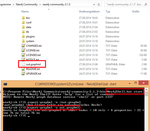 Das weitere Vorhaben lehnt sich im Grunde an dieses OrientDB Tutorial an. Gibt in der Konsole Neo4jShell.bat start ein und dann in der inneren Shell export-graphml -o out.graphml ein. Nun bekommt ihr die exportierte Datei out.graphml.