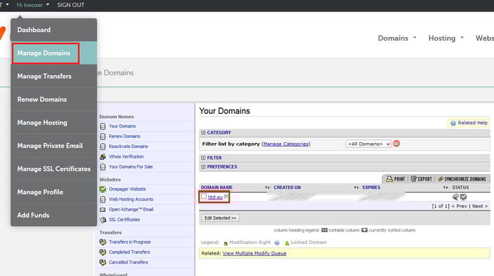 Wir gehen nun in die Administration von Namecheap. Dazu Manage Domains, danach auf eure gekaufte Domain.