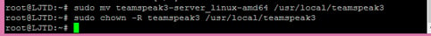 Danach ändern wir die sogenannte Ownership zu teamspeak3 mit sudo chown -R teamspeak3 /usr/local/teamspeak3.