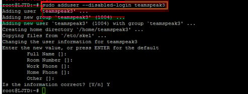 Wir benötigen nun einen Nutzer für TeamSpeak selbst. Dazu sudo adduser --disabled-login teamspeak3 eingeben und 5 mal ENTER drücken für die Standardwerte oder eigene