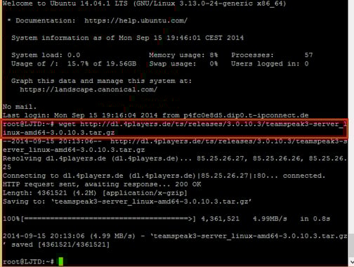 Nun wechseln wir in unsere putty-Konsole. Dort wget http://dl.4players.de/ts/releases/3.0.10.3/teamspeak3-server_linux-amd64-3.0.10.3.tar.gz eingeben. Und das Paket sollte