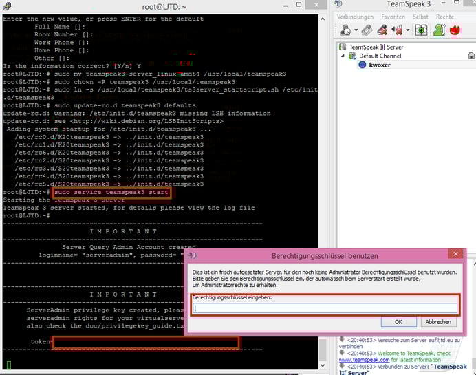 Jetzt starten wir TeamSpeak mit sudo service teamspeak3 start. Dies kann etwas dauern. Beim Abschluss bekommt ihr zunächst die Zugangsdaten des serveradmin