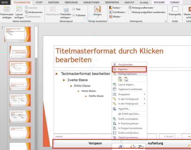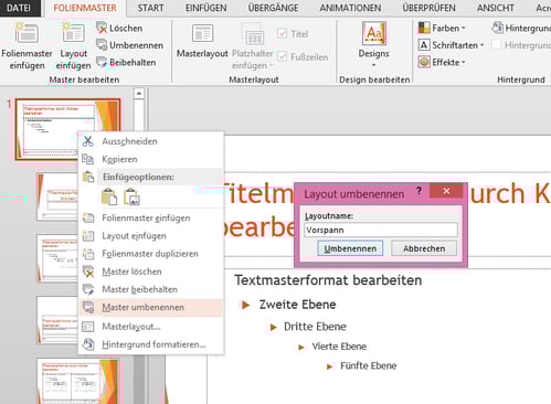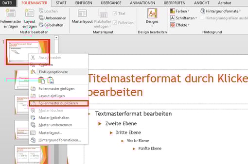 Wir befinden uns nun im Folienmaster und rechtsklicken das Layout. Es gibt derzeit nur eines, daher duplizieren wir es.