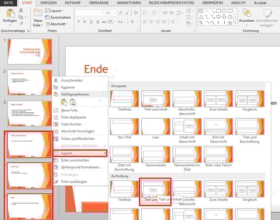 zwei Folien. Danach Rechtsklick und bei Layout den Vorspann Titel und Inhalt wählen.
