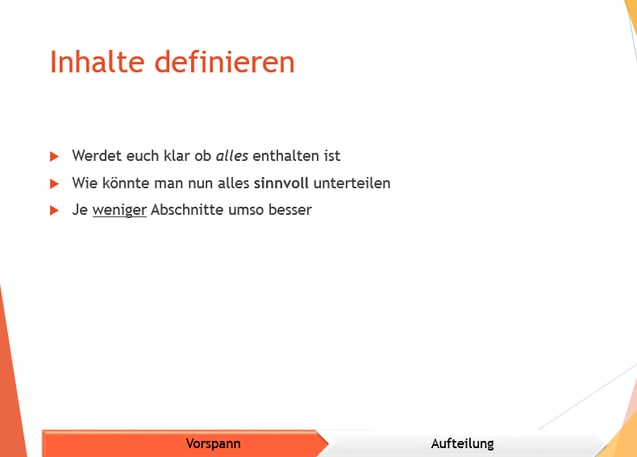 daran. Also bevor ihr loslegt, schreibt ihr am besten alle Folien fertig und gliedert sie schon einmal grob ein, damit man sie einfach von einander trennen kann,