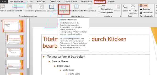 Um die Masteransicht/Folienmaster aufzurufen müsst in der Menuzeile ANSICHT wählen und dann den Folienmaster auswählen.