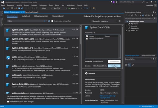 Wir klicken zunächst einmal auf EXTRAS, dann auf NuGet-Paket-Manager und am Ende auf Nuget-Pakete für Projektmappe verwalten. Jetzt SQLite eingeben und etwas Geduld mitbringen. Wenn die Liste erscheint einfach System.Data.SQLite auswählen und in euren Projekt (Versionen) einen Haken setzen.