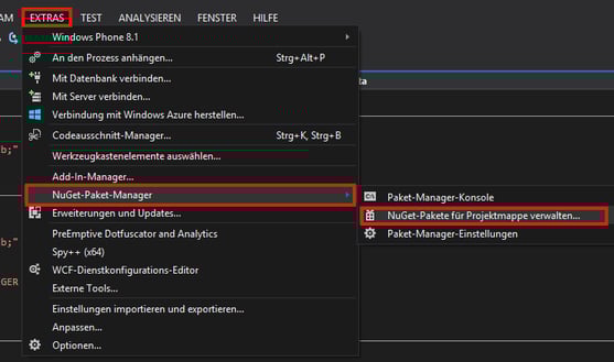EXTRAS, dann auf NuGet-Paket-Manager und am Ende auf Nuget-Pakete für Projektmappe verwalten.