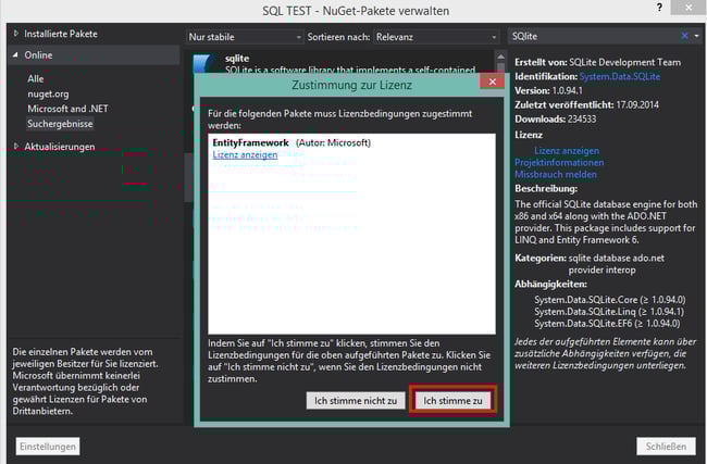 Jetzt suchen wir nach SQlite. Achtet darauf, dass die beiden ersten Buchstaben groß geschrieben sind sonst findest ihr leider nichts. Sehr sinnvoll Microsoft!