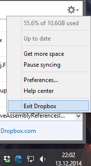 Geht nun Nummer Sicher, dass Dropbox beendet ist. Falls nicht einfach oben rechts anklicken und Exit Dropbox wählen.