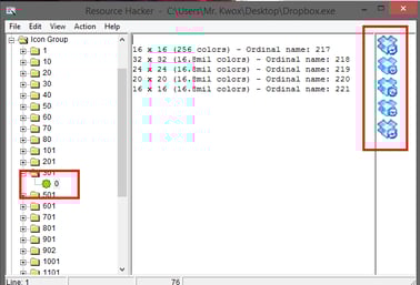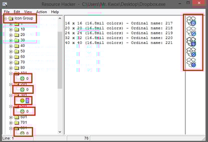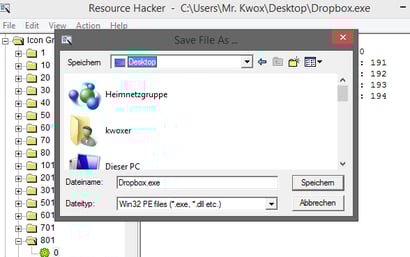 Nun brauchen wir die aktuelle Dropbox Version. Außerdem brauchen wir wieder den Resource Hacker. Ladet die aktuelle Dropbox Version mit RH ein. Jetzt wählt ihr wieder Icon Group aus.