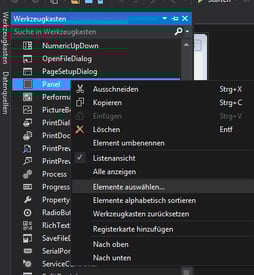 Öffnet nun euer Projekt und geht zur Designer-Ansicht. Dort die Toolbox öffnen und Rechtsklick in den Elemente-Bereich. Nun