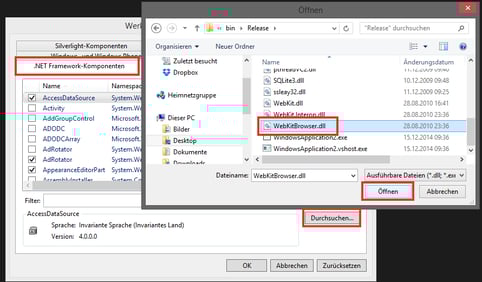 Jetzt den Net.Framework-Komponenten Reiter aktiv lassen. Auf Durchsuchen klicken. Dort dann nach der WekKitBrowser.dll suchen und auf öffnen.