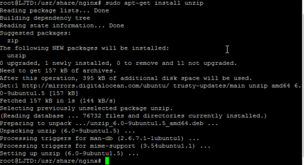 Jetzt werdet ihr sehr wahrscheinlich kein unzip installiert haben, daher sudo apt-get install unzip. Jetzt können wir unzip nutzen.