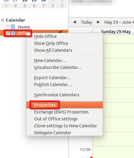 Wir schalten jetzt noch die nervigen Alarme ab. Dazu ein Rechtsklick auf euren Kalender und Properties wählen.