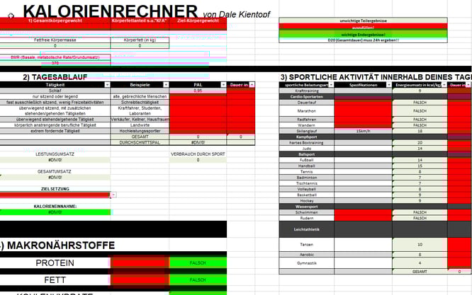 Das Hauptproblem der meisten Leute ist eindeutig die Ernährung. Jeder haut sich zu viel Zucker täglich rein. Oder vergisst, das Obst auch nur Zucker ist und cheatet quasi das gesamte Leben unbewusst seinen Ernährungsbedarf. Der Kalorienrechner kann hierbei schon sehr gut helfen. Man füttert die Excel-Datei mit ein per Daten von sich. Tragt also ein wie viel Sport ihr macht und was ihr normalerweise den ganzen Tag macht (im Durchschnitt). Daraus kann man dann den täglichen Kalorienbedarf ermitteln. Jetzt müsst ihr noch angeben ob ihr abnehmen wollt oder gerne Muskeln ausbauen wollt. Hier ist natürlich auch klar ersichtlich, dass alles nur bezogen auf die Kalorienanzahl ist. In diesen Fällen also ein Überschuss oder Mangel. Die Richtwerte für Protein, Fett und Kohlenhydrate sind natürlich auch sehr entscheidend für das Erreichen des Ziels.