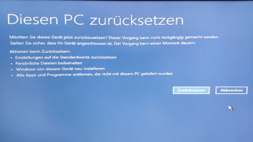 Nun gut, dann eben den PC zurücksetzen. Schließlich sind meine Daten nicht auf der C Platte, sondern sauber partitioniert, wie es sich gehört. Doch auch ein Zurücksetzen war nicht möglich. Windows verweigerte auch dies mit einer Meldung wie "Der PC kann aus unbekannten Gründen nicht zurückgesetzt werden". Toller Grund, danke Microsoft!