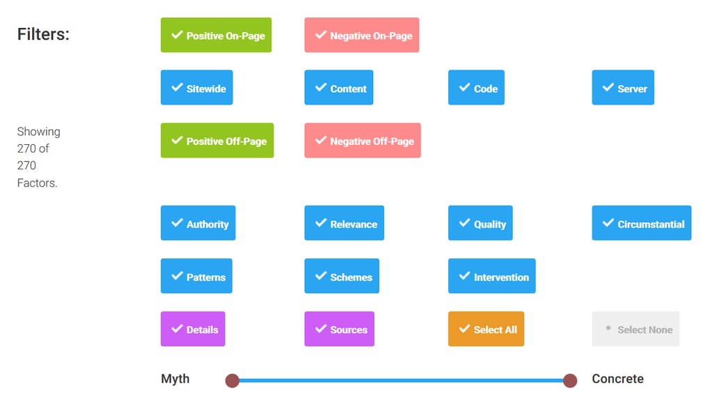 Es existiert mit Northcutt nun eine interaktive Webseite mit welcher sich die verschiedenen Google Ranking Faktoren anzeigen lassen. Das schöne daran ist, dass diese sehr übersichtlich angezeigt werden und die einzelnen Kategorieren sich allesamt abschalten lassen, wenn man nur spezielle sehen möchte. Zusätzlich wird zwischen Mythos und wirklich konkreten Faktoren unterschieden. Oder besser gesagt wird versucht vorhandene Informationen über die Faktoren möglichst wissenschaftlich zu belegen.